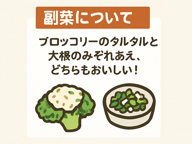 - ブロッコリーのタルタル:クリーミーな味わいで好評。副菜2品構成としては量も十分との声が多い。